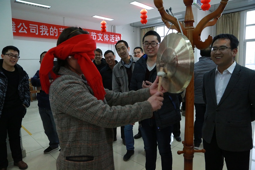 在瞎子敲鑼游戲中,大家爭先恐后地排在一起,只見敲鑼者蒙著雙眼,手持擊鼓棒,一步一步向前走去,這時,有“好心人”在一旁不斷的吆喝著:“向左走、向右走、往前走……”一名職工在他們的引領下,一棒擊下,因用力過猛,未擊中,一個釀蹌,引得在場的所有人捧腹大笑,卸掉圍巾,發(fā)現(xiàn)自己離銅鑼還有一米多遠,知道上當受騙,跑上前去與“好心人”追逐著、嬉戲著扭在一起。