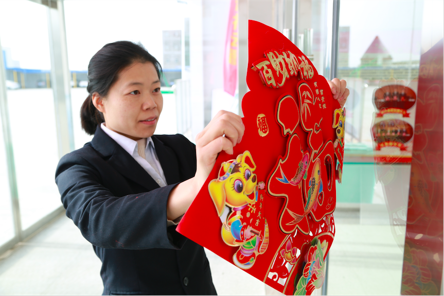 隨著新年對聯(lián)的展出,近幾日該公司對門廳、餐廳等地也進(jìn)行了裝飾,掛燈籠、貼窗花,工作人員張燈結(jié)彩、扮靚家園,到處都是紅紅火火鬧新春、煥然一新過大年的景象。該公司安排專人對門廳玻璃進(jìn)行了集中清潔,透亮的玻璃上貼上紅色的窗花、福字顯得格外耀眼,大廳內(nèi)、餐廳里,每個(gè)照明燈下都掛上了一串串火紅的燈籠,到處都彌漫著濃濃的年味兒,新年的氣息遍灑每一個(gè)角落。